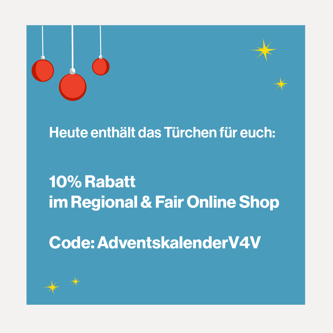 Unser Kooperationspartner Regional&Fair hat mit den Wichteln verhandelt und ein Rabattcode über 10% auf alle Waren in den Adventskalender gelegt.